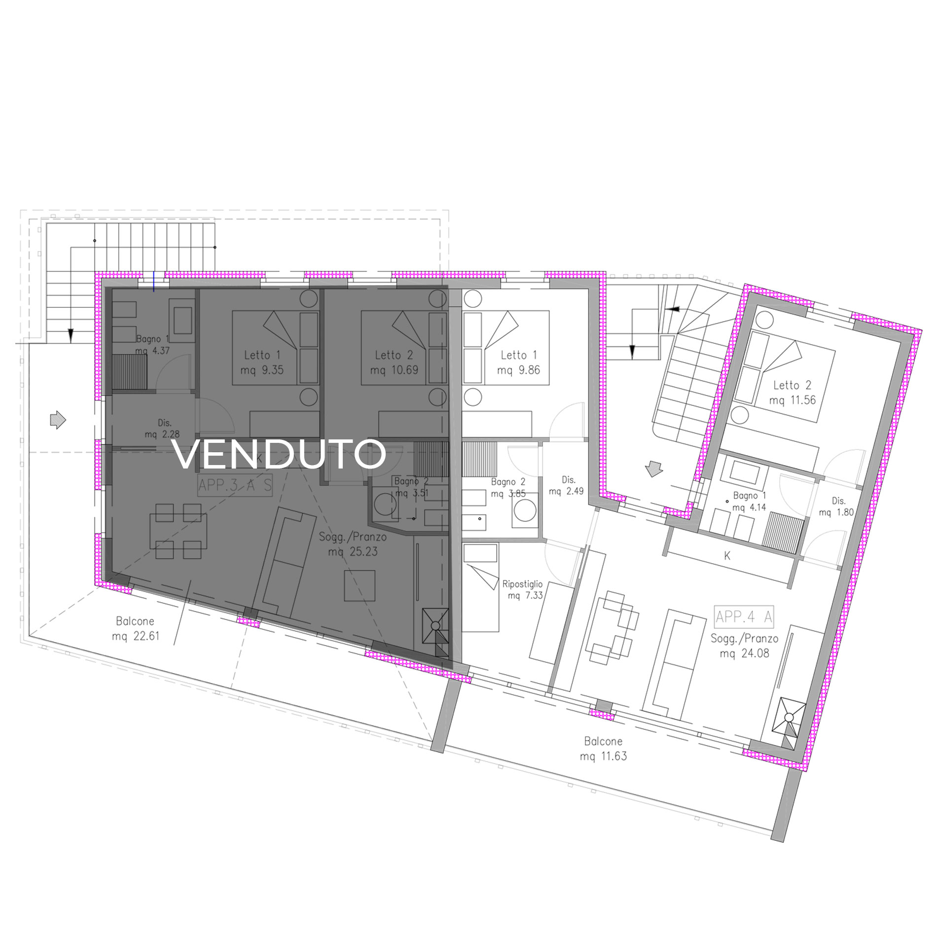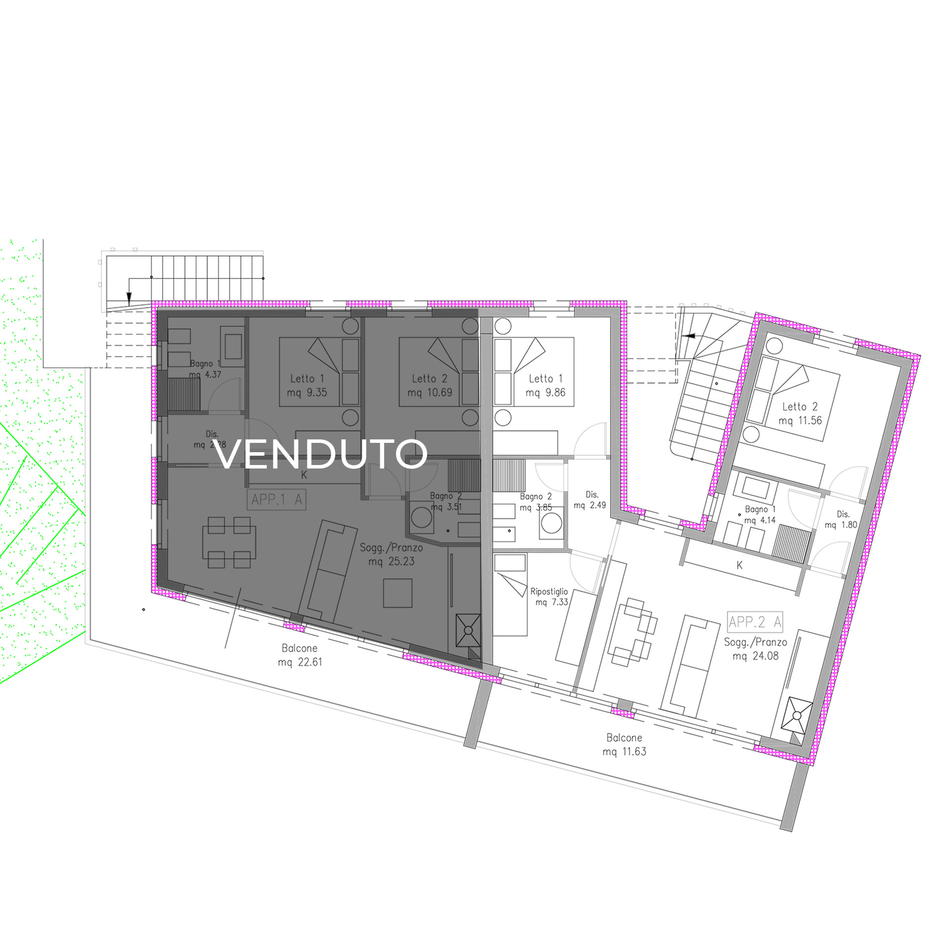 La costruzione sarà composta da trilocali e quadrilocali di ampie metrature, tutti con doppi servizi. Gli appartamenti al piano terra disporranno di giardini privati ed al piano primo di balconi panoramici.